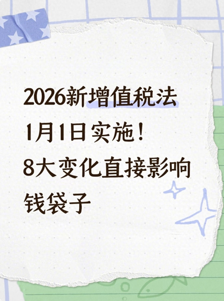 2026年的脚步声越来越近,一项关乎全国数千万企业、14亿消费者的重磅政策即将落地——《中华人民共和国增值税法》将于1月1日正式施行,沿用33年的《增值税暂行条例》同步退出历史舞台。这可不是简单的政策修修补补,而是我国第一大税种(占全国税收收入超30%)从“行政法规”到“法律”的质的飞跃,8大核心变化每一条都戳中钱袋子,不管你是开小店的个体户、运营公司的老板,还是拿工资的打工人,都躲不开、绕不开,早看懂早省钱,不懂可能要多缴税。